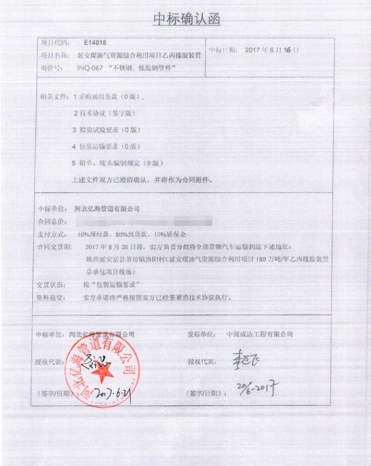 我公司成功中標(biāo)成達院延能化項目乙丙橡膠裝置不銹鋼、低溫鋼管件
